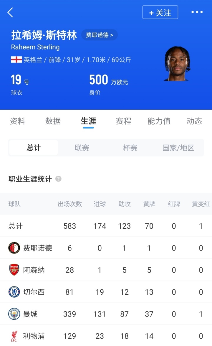 今年1月,斯特林与切尔西提前解约,随后自由身加盟费耶诺德,本赛季斯特林仅为费耶诺德出战6场比赛,贡献1次助攻。